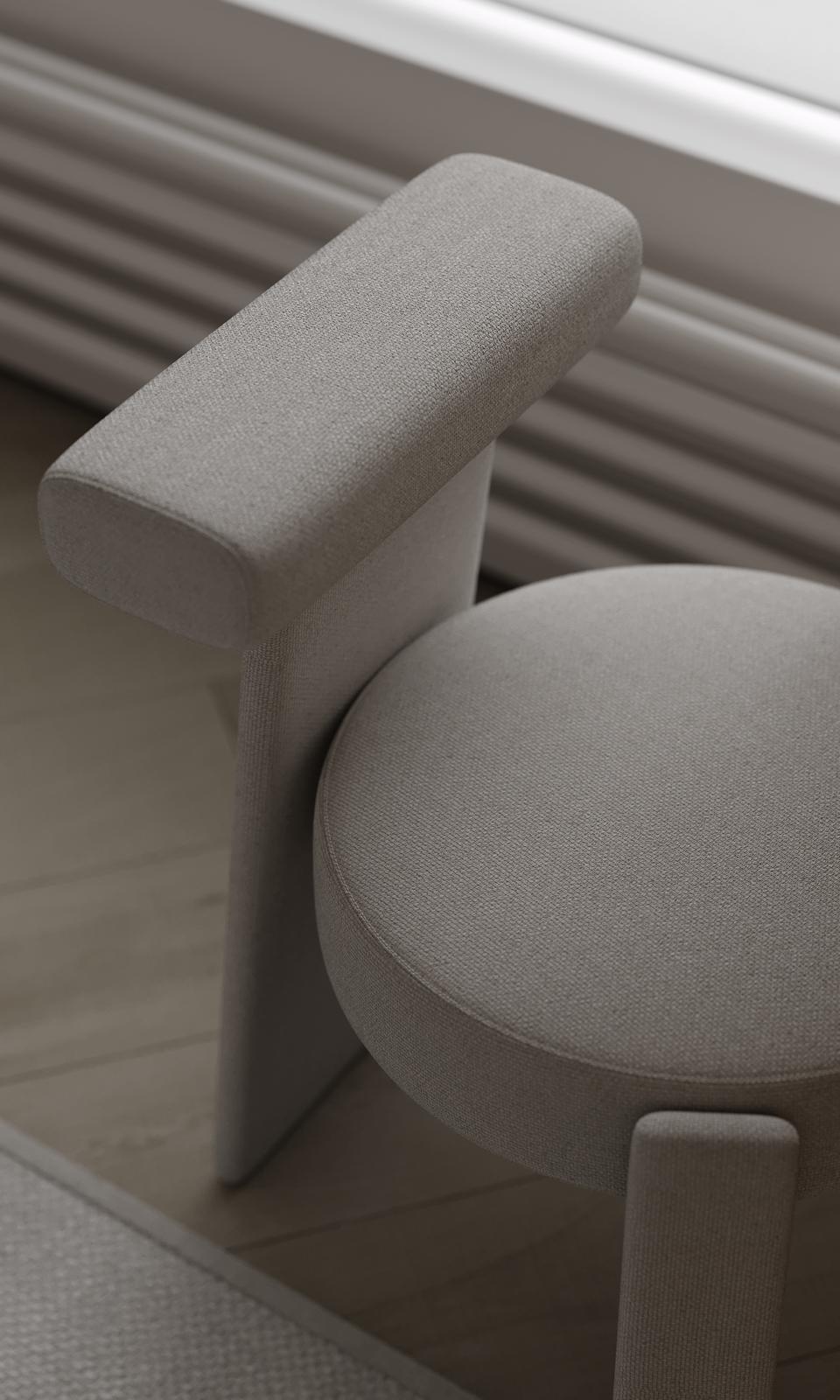 A serene interior where geometry meets comfort. This space is a study in monochromatic harmony, focusing on the interplay of bold, sculptural shapes and a neutral, calming palette. It is designed for those who find beauty in silence and architectural precision.