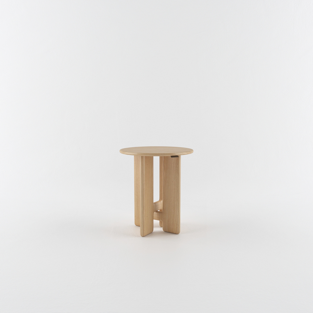 The table features a signature architectural base with rounded, converging legs that create a striking central support. With a diameter of 45 cm, it retains the bold visual impact of its larger counterpart. Handcrafted from premium solid ash or solid oak, each piece showcases beautiful natural grain patterns and expert woodworking craftsmanship.