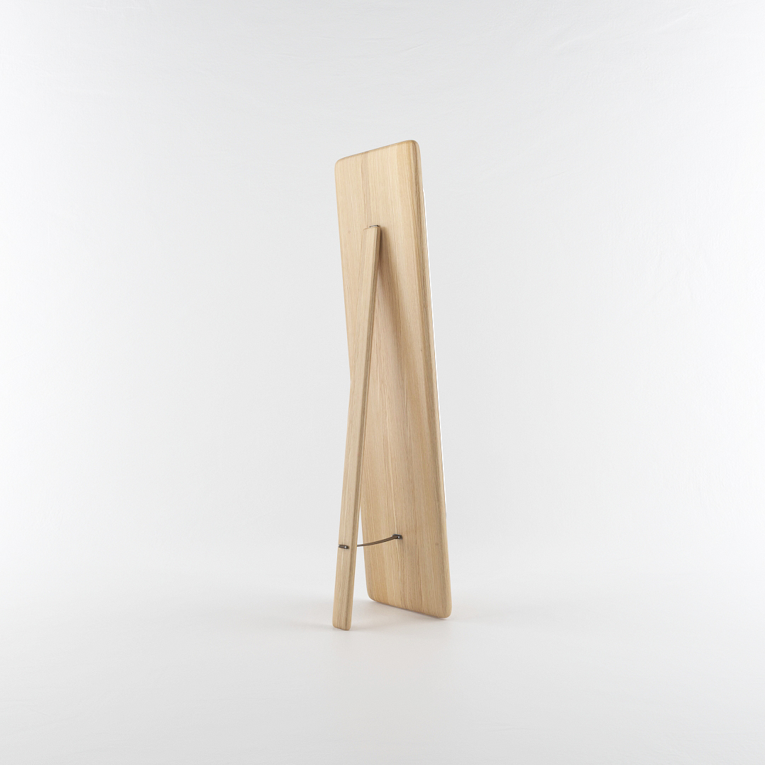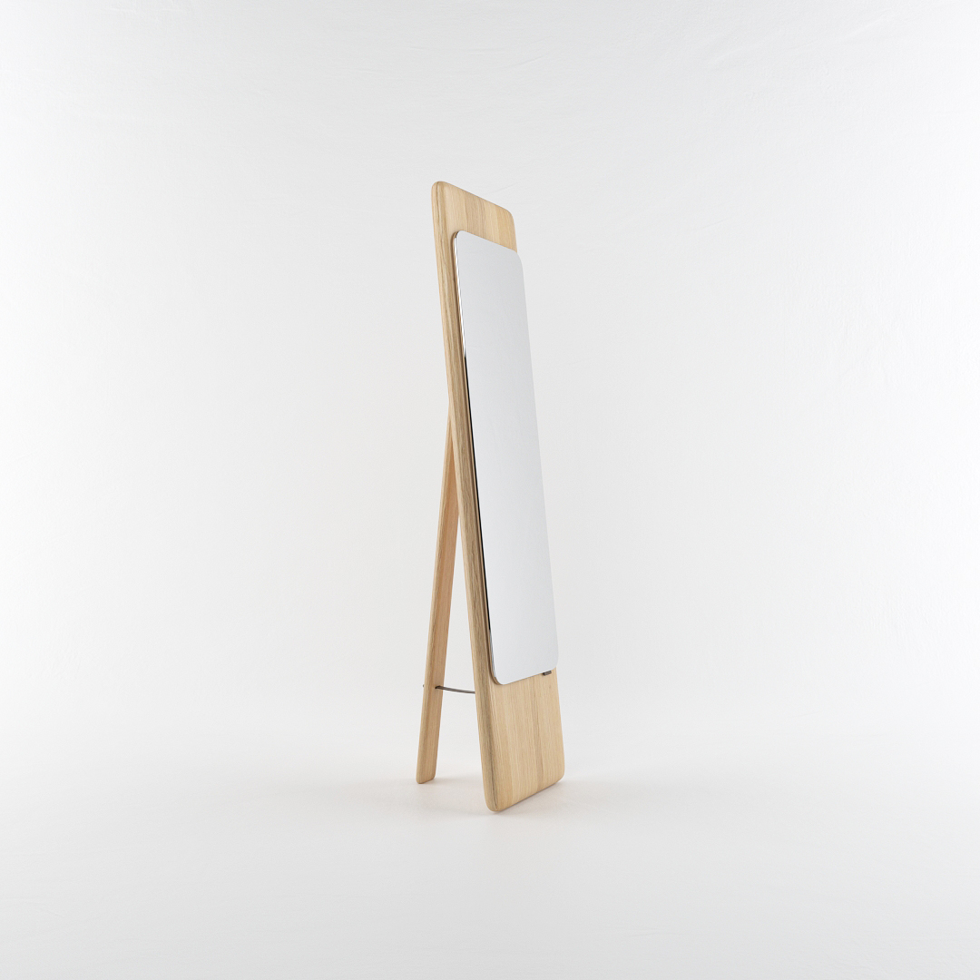 The mirror is supported by gracefully curved wooden legs that tilt back at an angle, creating a dynamic visual contrast between stability and movement. The frame is made from high-quality ash or oak, with beautifully rounded wooden panels at the top and bottom that support the generous mirror surface.