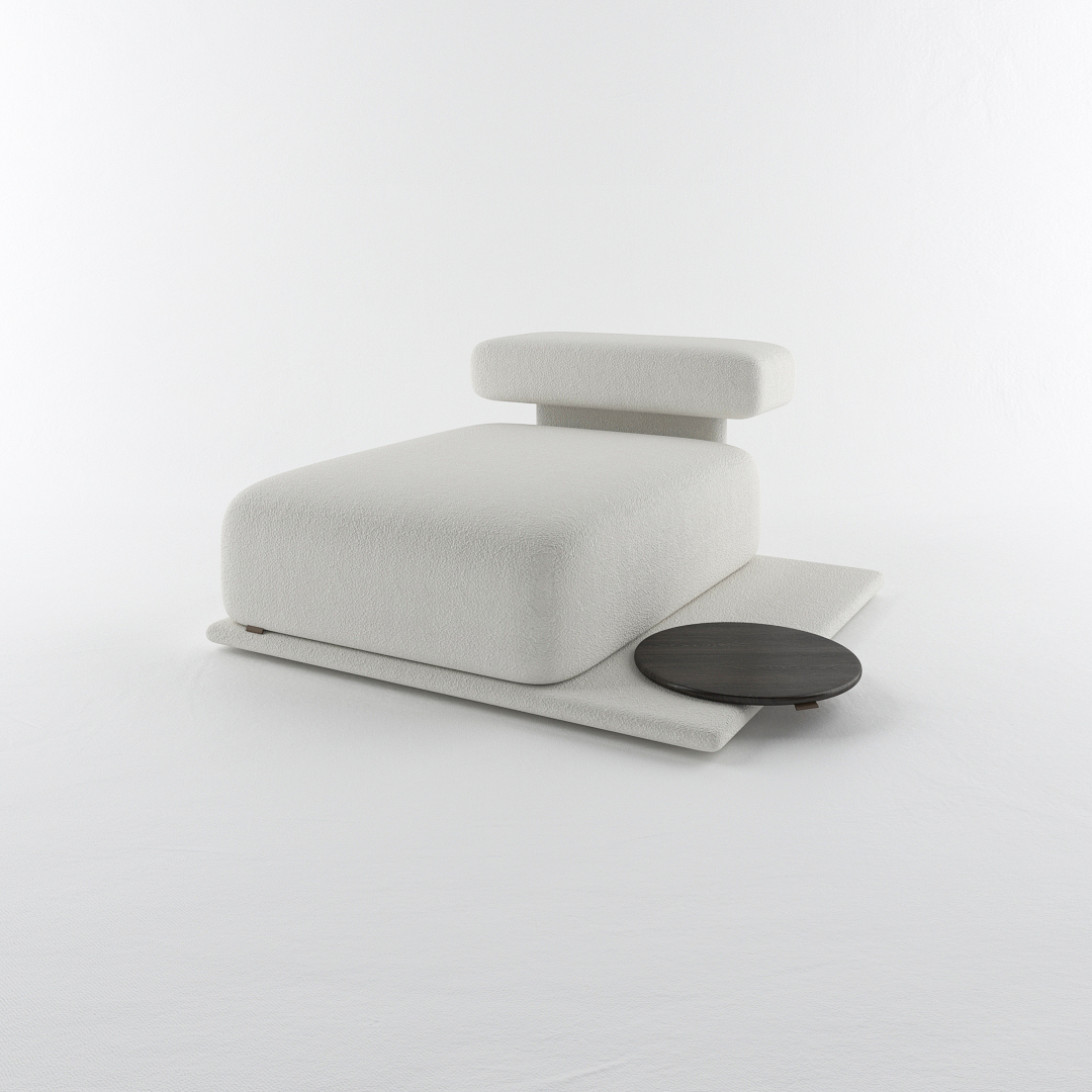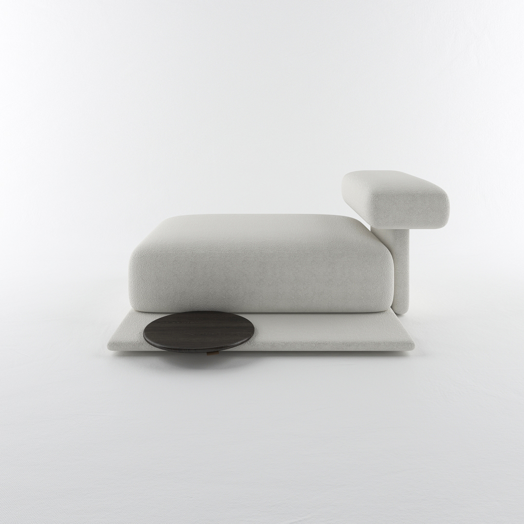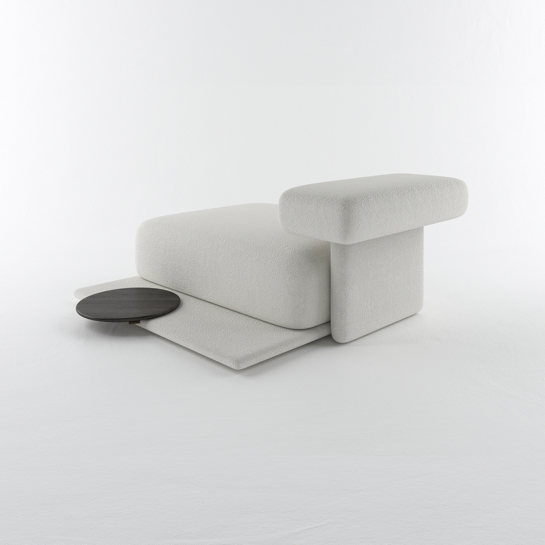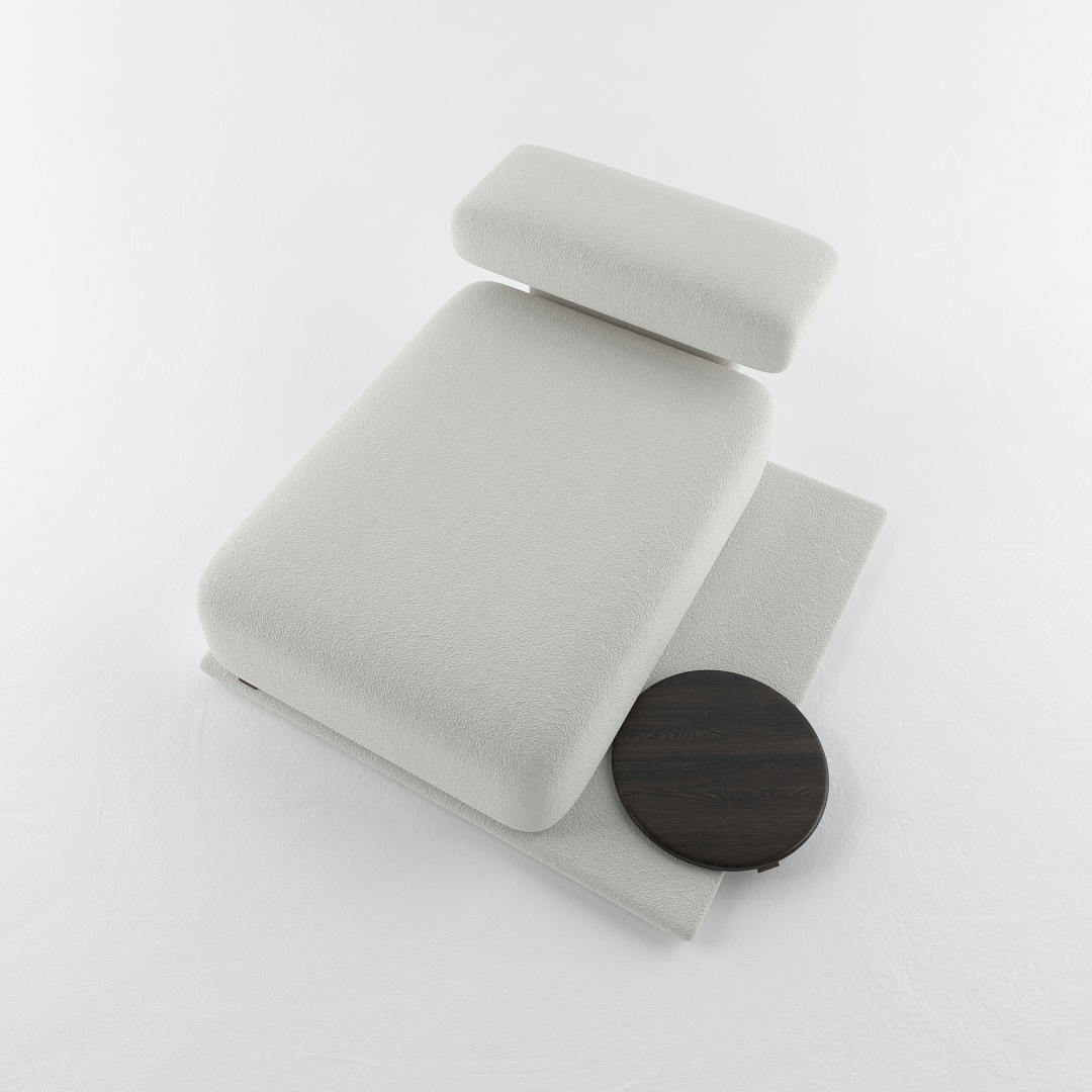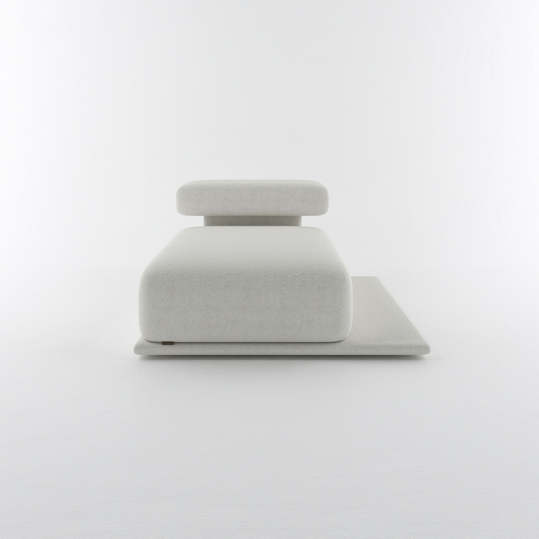 Designed with the collection’s signature low-profile platform and oversized rounded cushions, this elongated module offers a generous surface area for stretching out in complete comfort. The extra-deep seating accommodates multiple relaxation positions while maintaining the clean architectural lines and sculptural presence that define the Lukas aesthetic. Wrapped in premium bouclé upholstery, the substantial cushioning provides a tactile and luxurious feel.